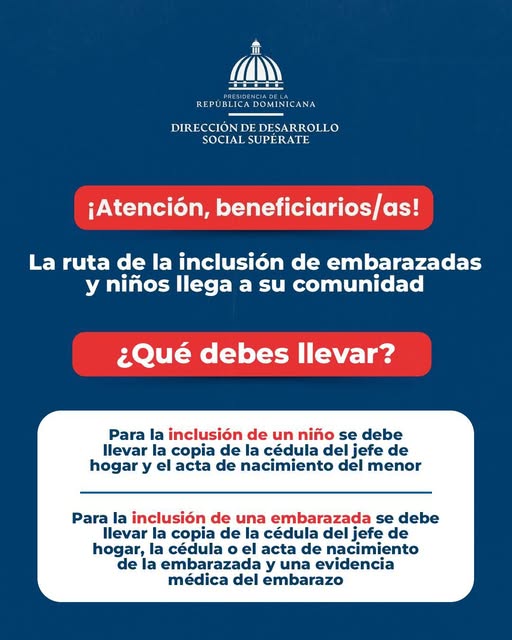 agosto 28, 2025 La ruta de inclusión de embarazadas y niños llega a Guananico. Lunes 01/09/2025 De 9:00 a.m. a 12:00 PM Sala Capitular del Ayuntamiento de Guananico Este operativo va dirigido exclusivamente a las personas que ya tienen sus tarjetas Supérate. Si tienes hijos menores de 5 años o alguien en tu hogar está en estado de embarazo, califican para la inclusión. ¡No olvides llevar la documentación requerida! Comparte y Comenta